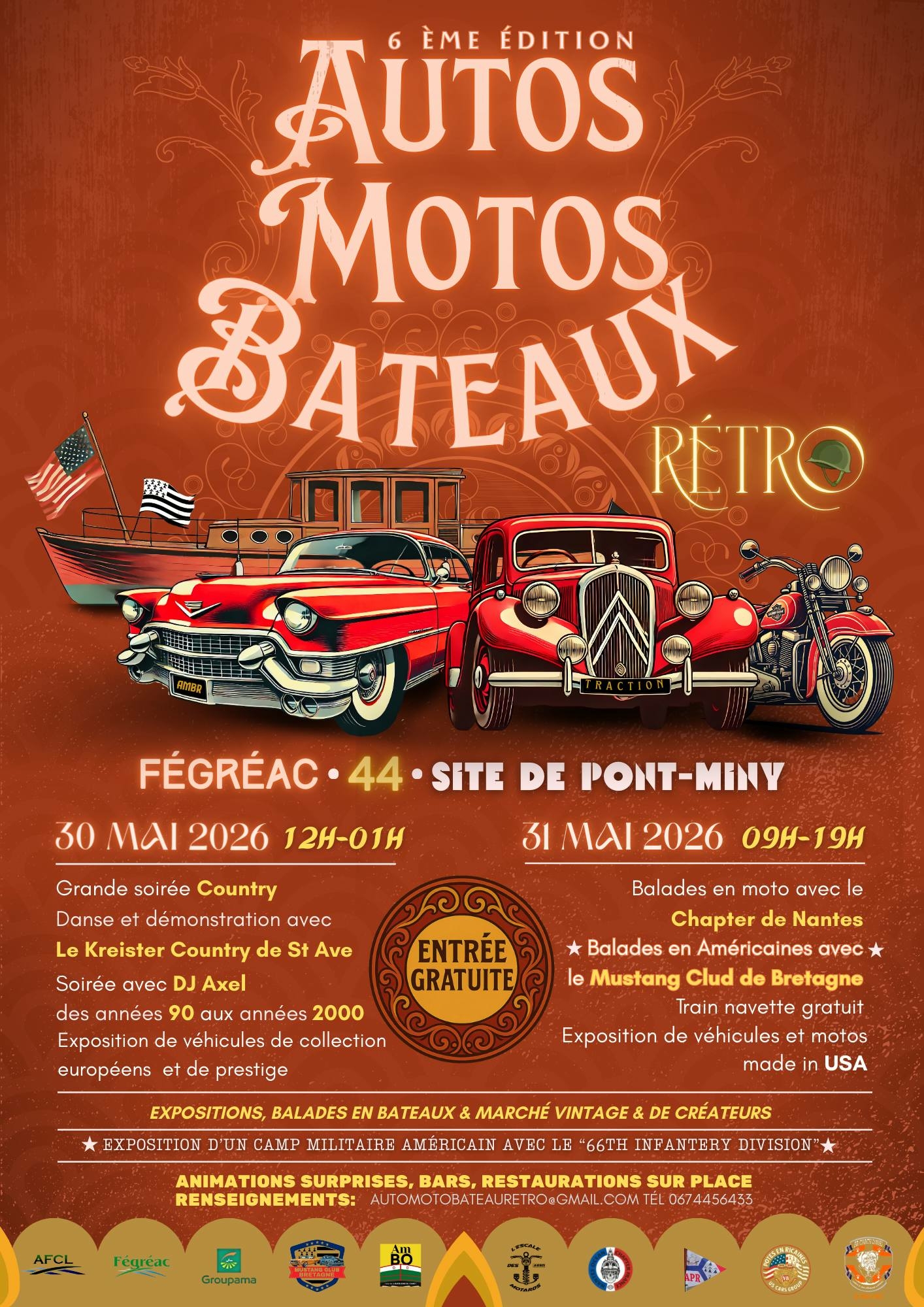 Organisé par la Mairie de Fégréac les 30 Mai et 31 Mai 2026 avec la participation des Associations de Redon et Blain pour les Bateaux et de l’Association Jo’s American Car Team pour les Voitures Américaines.