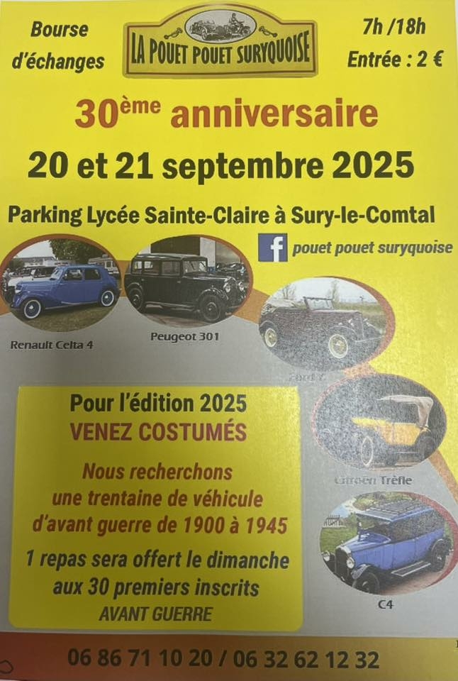 RV le 20 et 21 Septembre 2025 sur le parking du Lycée Ste Claire à Sury-le-Comtal de 7h à 18 h.
