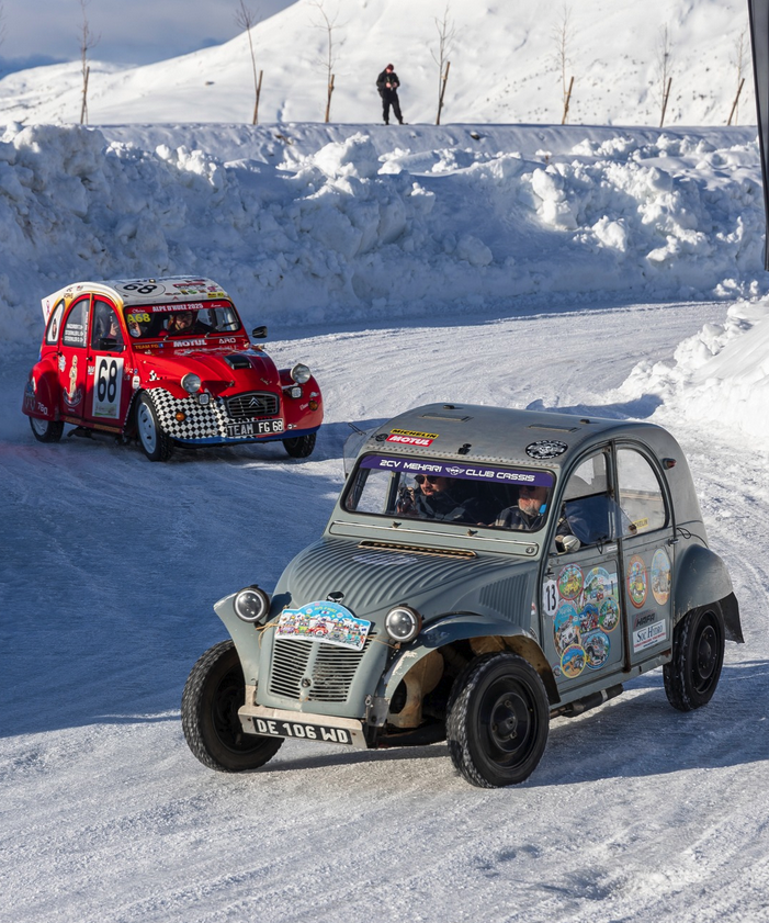 Course sur glace réservée aux 2cv, Méhari, Dyane, 2CV Fourgonnette… avec des manches spectaculaires pour tous les amateurs de glisse et de vitesse.