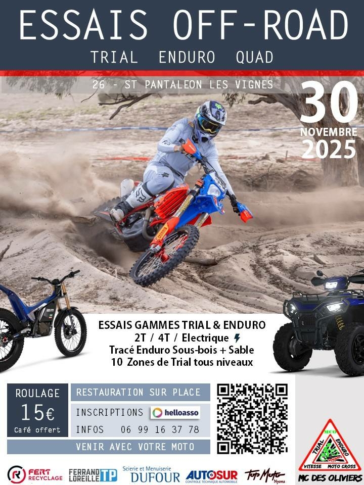 Participation pilotes : 15 € Inscriptions : https://www.helloasso.com/associations/moto-club-des-oliviers/adhesions/essais-trial-et-enduro-modeles-2026/1