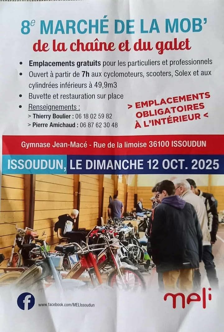 Le club Moto de la MELI organise le dimanche 12 octobre, le 8eme Marché de la Mob, “du galet et de la chaîne” à Issoudun.