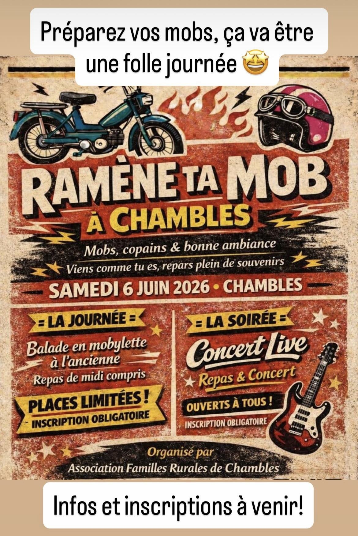 Après les 2 éditions de “Ramène ta caisse à Chambles”, l’AFR de Chambles organise sa première édition de “Ramène ta mob à Chambles”.