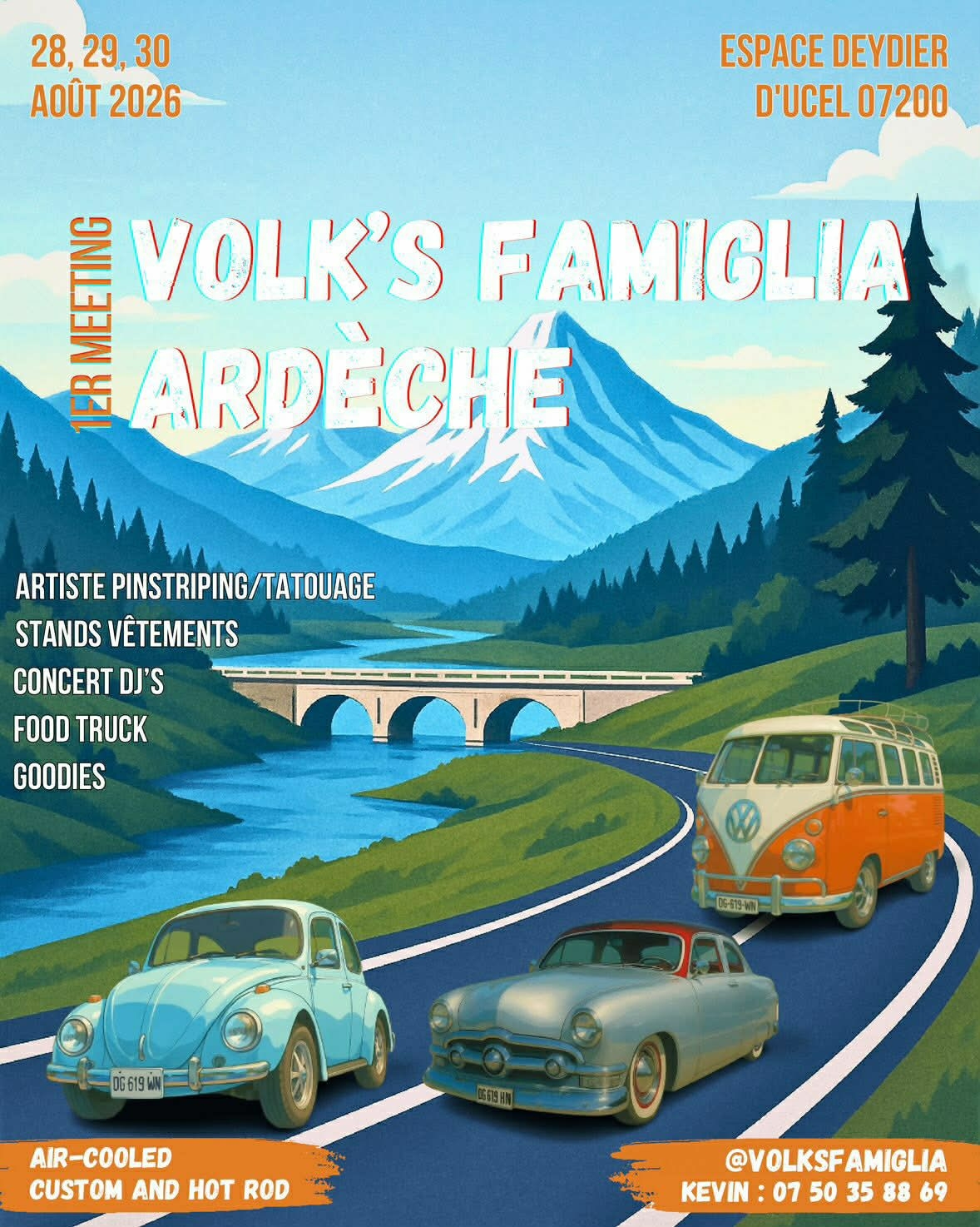 Les passionnés de belles mécaniques sont invités à se retrouver pour un grand rassemblement dédié aux voitures américaines pré-1970, Customs, Hot Rods, ainsi qu’aux véhicules Aircooled (Cox, Combi T1, T2 ,T3 dérivés, etc.), dans un cadre exceptionnel entre rivière et patrimoine ardéchois, avec une superbe vue sur le château d’Aubenas.