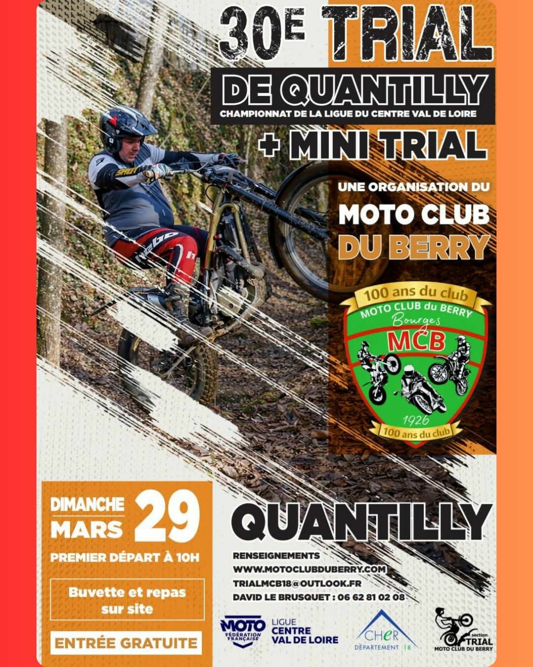 Venez voir nos meilleurs trialistes sur leur moto dans les zones du Bois des Noyers et dans le bourg de Quantilly sur la zone artificielle.