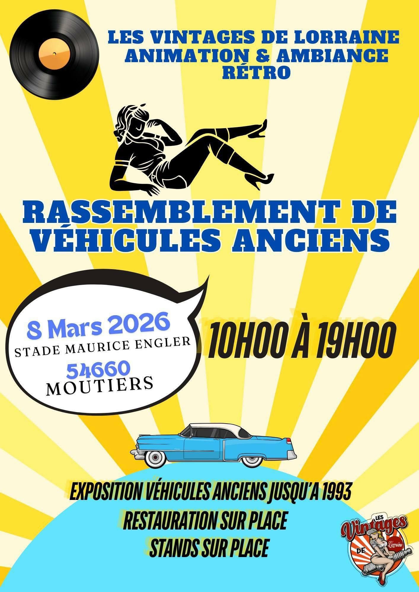 Nous avons le plaisir de vous convier à notre grand rassemblement de véhicules anciens, qui se tiendra le dimanche 8 Mars 2026, de 10h à 19h, au stade Maurice Engler à Moutiers.